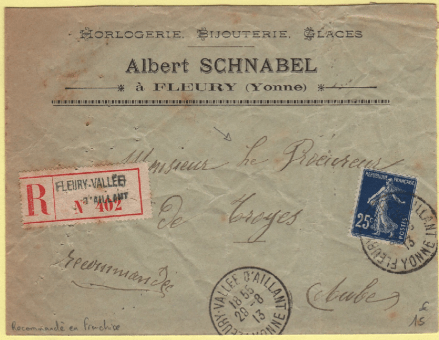 Lettre recommandée en franchise, Fleury Vallée d’Aillant (Yonne) pour Troyes (Aube), août 1913