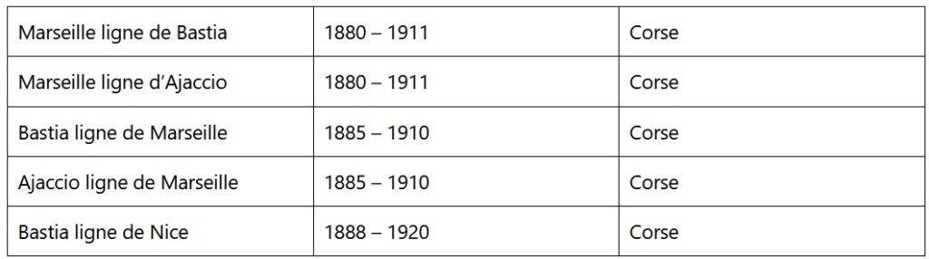 Dès 1836 des liaisons régulières avaient été mises en place entre Toulon et Bastia et entre Toulon et Ajaccio, suivies en 1843 par des liaisons entre Marseille et Bastia et entre Marseille et Ajaccio. En août 1850 ces liaisons furent attribuées à des compagnies privées qui disposaient alors de Boites Mobiles. A partir de 1880 fut mise en place une nouvelle ligne, matérialisée par un nouveau cachet, « MARSEILLE, LIGNE DE … ».