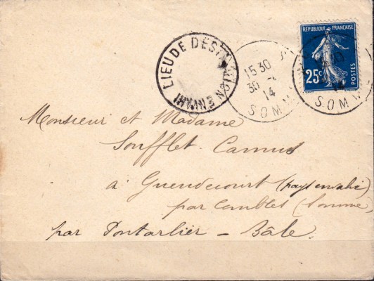Amiens, 30 août 1914 pour Gueudecourt (Somme) : rupture du service postal, « LIEU DE DESTINATION ENVAHI »