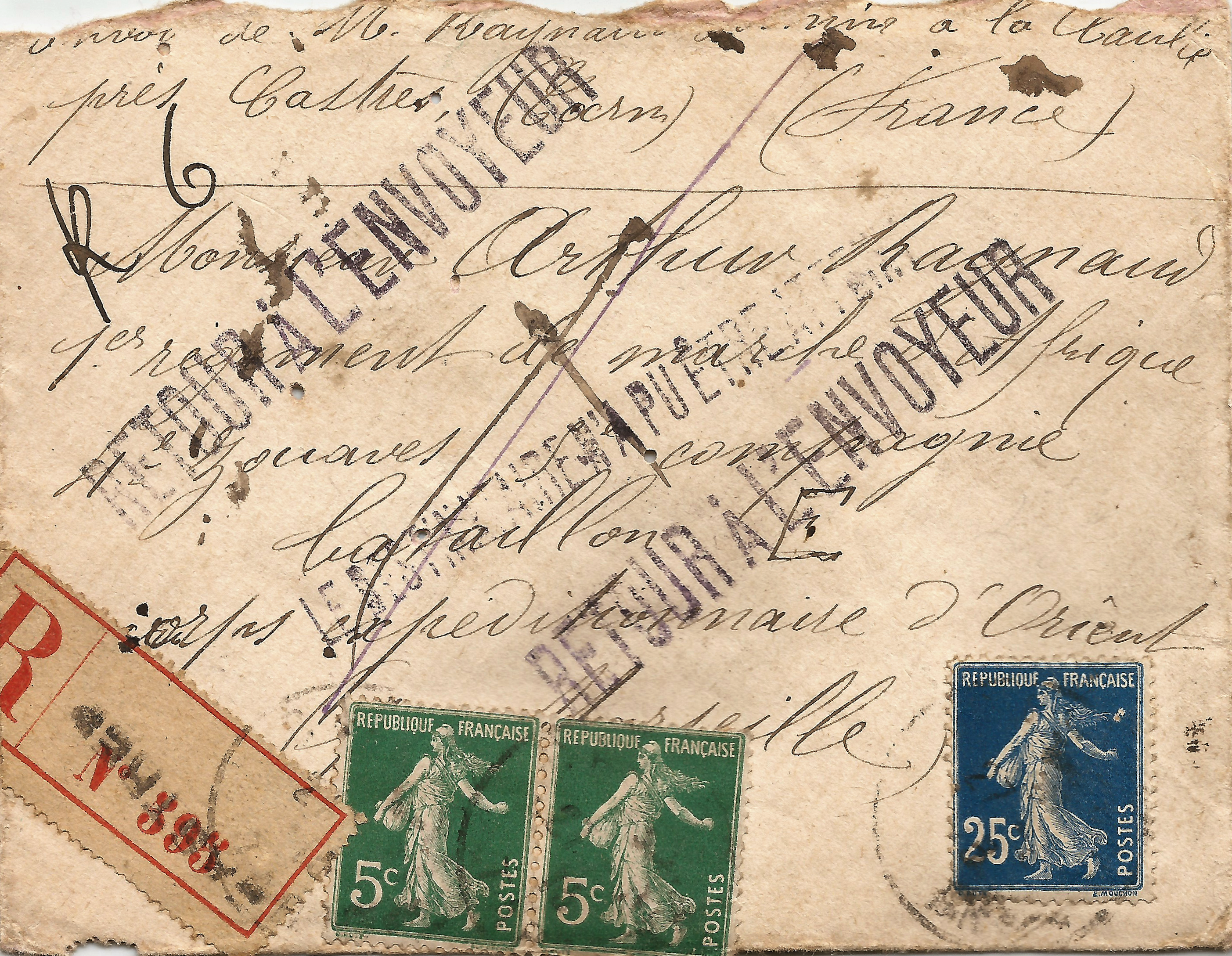 Pour indiquer le renvoi sur le bureau initial, on apposa en accord avec le bureau de poste civile de la localité la griffe « RETOUR / A L’ENVOYEUR / Numéro » Ce numéro étant un numéro d’ordre de la nomenclature des bureaux.