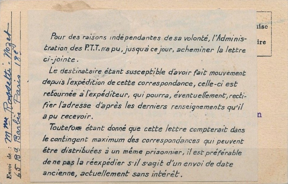 Le verso porte la mention « LIEU DE DESTINATION ENVAHI » ce que l’expéditeur savait parfaitement, puisque la lettre fut envoyée sous couvert de l’action de la Croix Rouge de Genève.