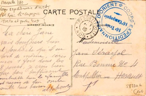 Marseille a été un bureau central militaire pour les opérations de la guerre en Orient. On trouve des cachets de dépôt (114° RT, 10° RA, pharmacie générale, isolés métropolitains…) des cachets du matériel de réserve, de la base américaine N°6, des « Indous » de Marseille, des convois automobiles.