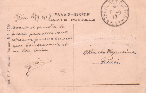 3 – Par contre, la griffe n’est pas apposée sur les plis de Corfou vers Salonique, dont les dépêches sont prises en charge par la poste militaire française via Tarente.