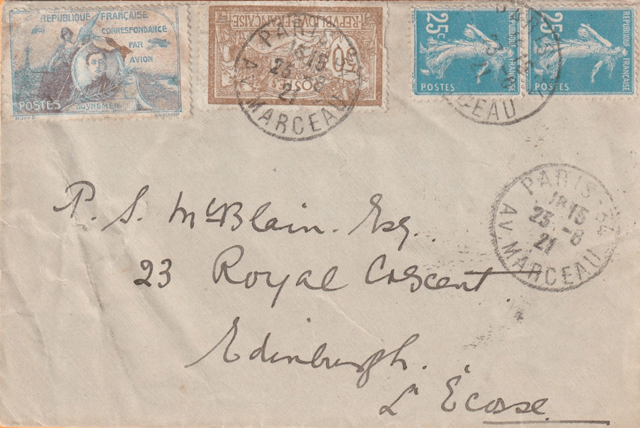 Affranchissement composé d’une Semeuse 25c et de trois Merson 1f. Inscription manuscrite « Par Air/Paris-Londres ». Vu en vente sur http://www.airmails.co.uk/archive-country/France/