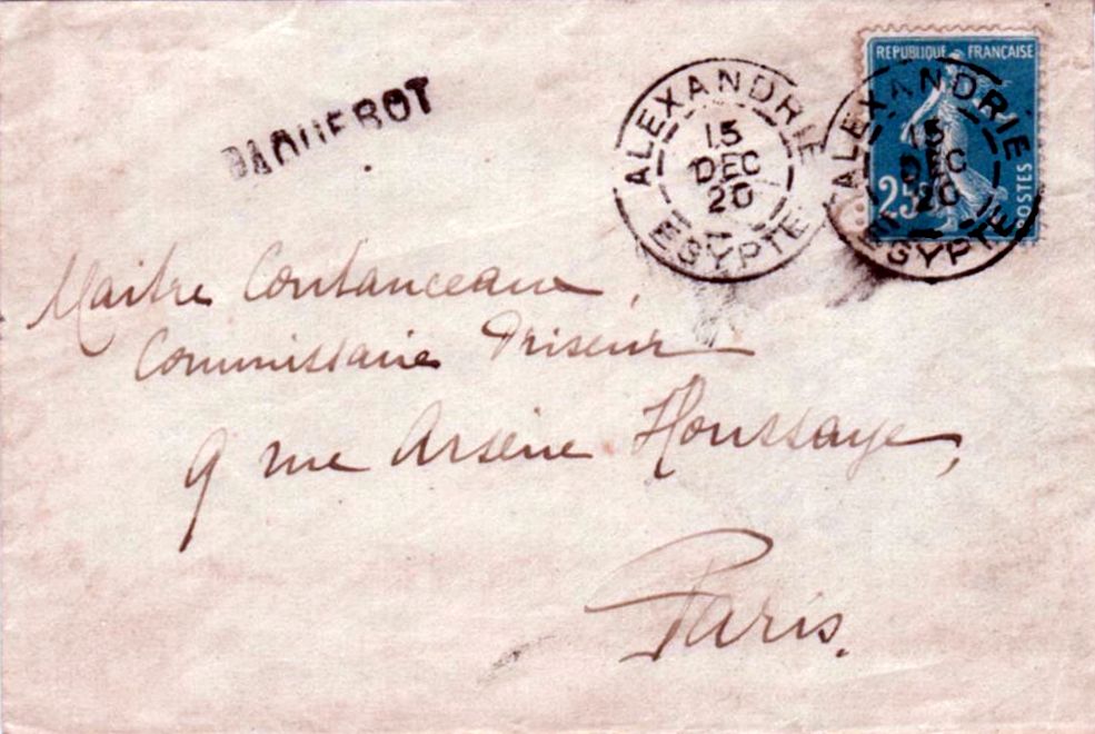 Alexandrie : Cachet à date et griffe PAQUEBOT, 15 décembre 1920