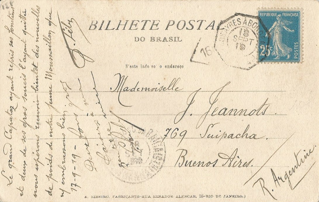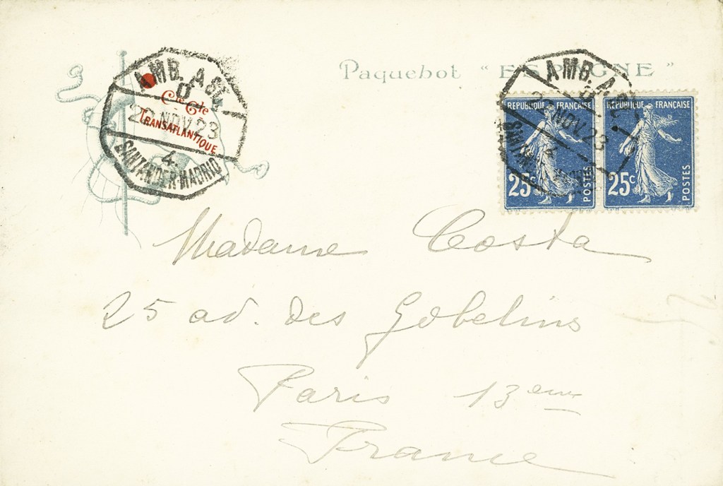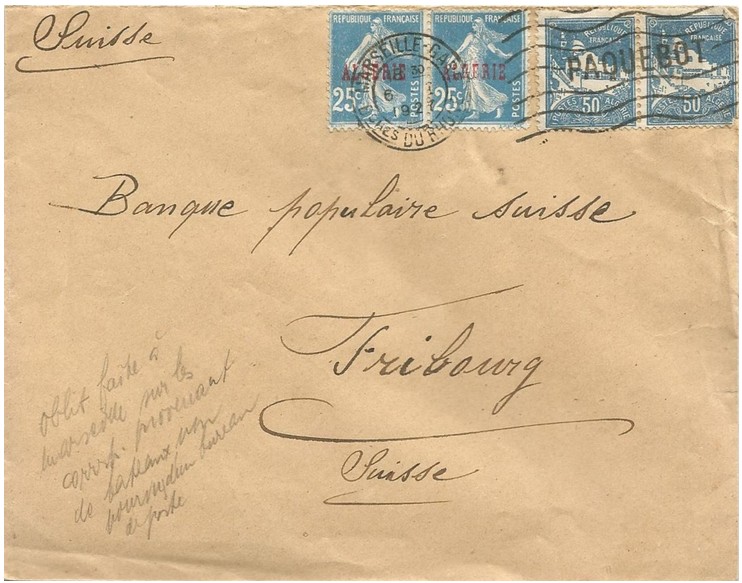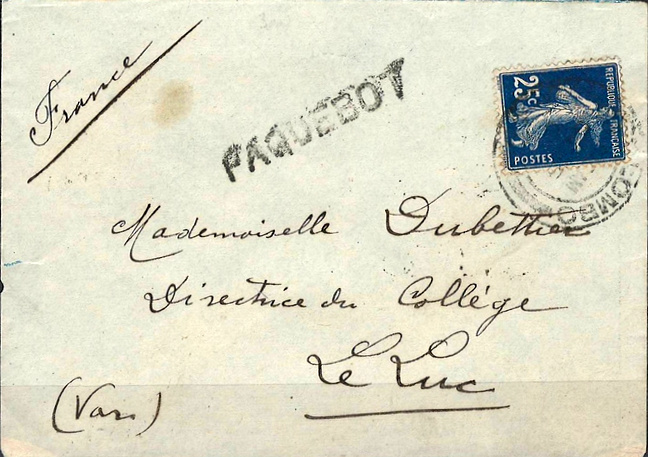 - Les navires en partance postent souvent leur courrier, rédigé à bord, dans des ports étrangers afin qu’il puisse être transbordé et acheminé plus rapidement vers les destinations finales. Dans ces cas, les lettres portent souvent l’oblitération « Paquebot » du port de transbordement plutôt que celle du port de destination finale.