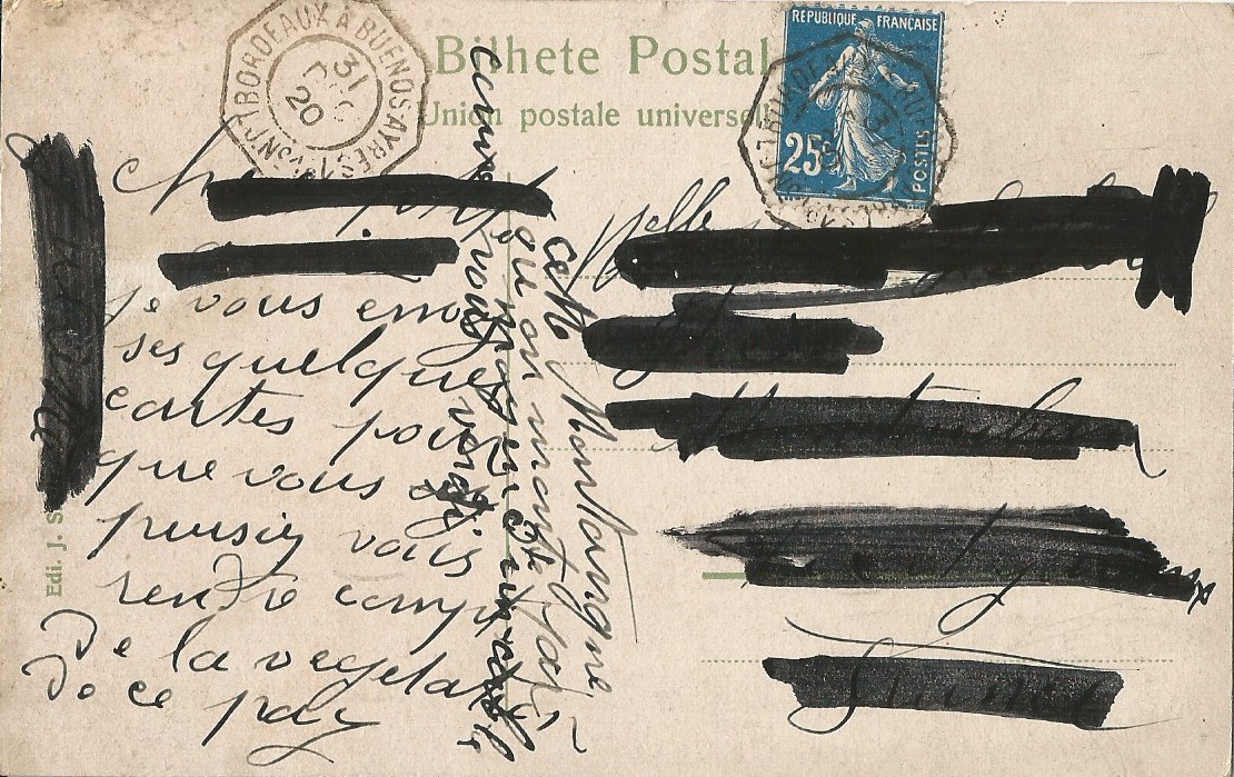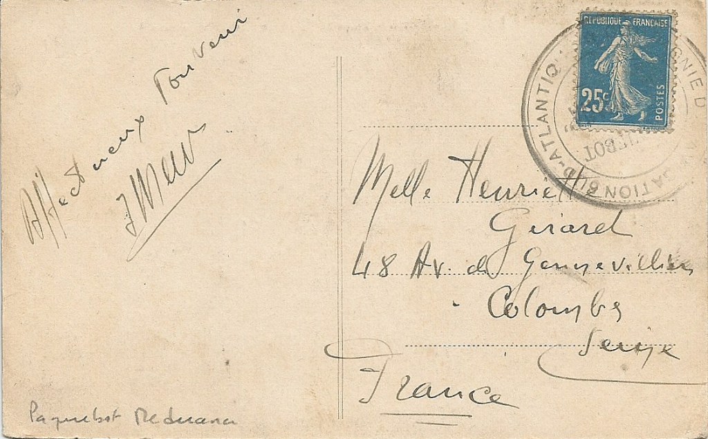 En 1921 les contrôleurs postaux furent supprimés : avec eux disparurent les cachets de ligne habituels. Ces cachets furent alors remplacés par les grands cachets ronds, ovales, rectangulaires des commissaires de bord des navires afin d’affranchir les correspondances remises par les passagers. Sur les lignes de l’Atlantique Sud on connaît les marques des navires suivants après 1921 : Alba, Lutetia, Massilia, Meduana (2 marques différentes), Mosella, Samara. D’autres navires bien sûr avaient croisé sur ces mers : le Burdigala et le Gallia (disparus en 1916), le Sequana (disparut en 1917), le Bretagne, le Divonna, La Gascogne jusqu’en 1919, par exemple.