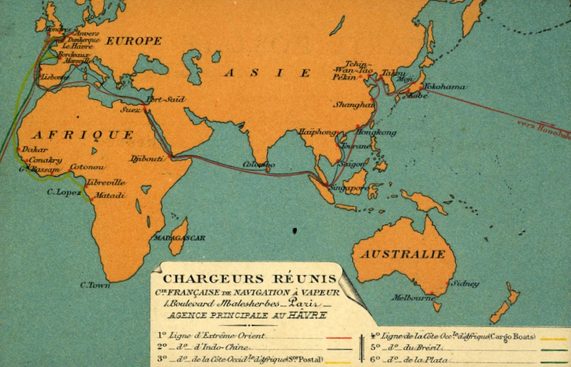 - Les lignes de l’Extrême-Orient, via Saïgon, Hong-Kong, Shanghai, Yokohama, Kobe.
