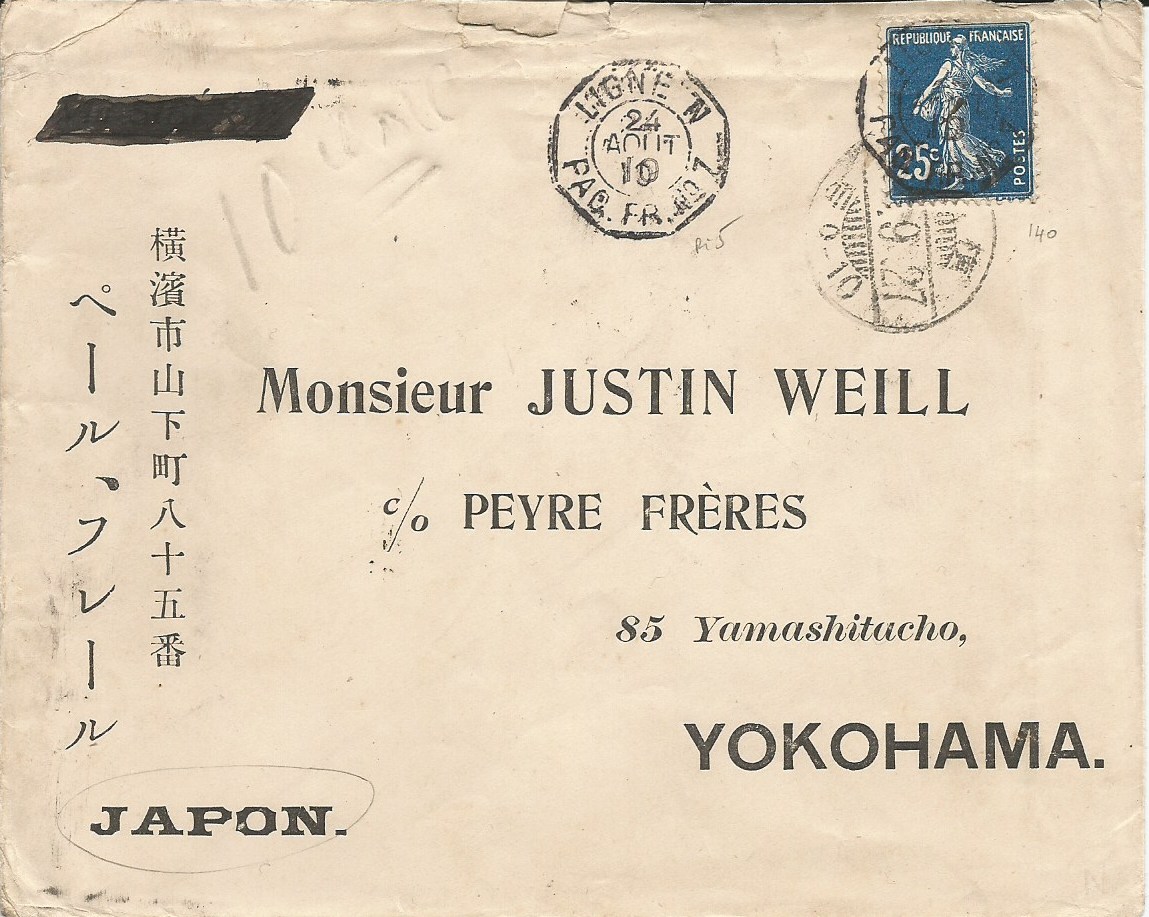 Ligne N PAQ FR N°1, 24 août 1910, oblitération arrivée Yokohama 27 septembre