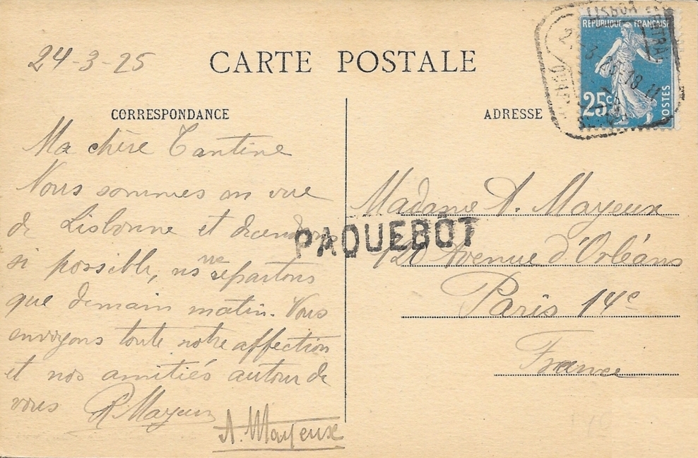 Lisbonne : Cachet à date Lisboa Central et griffe PAQUEBOT, 25 mars 1925, posté à bord du Mosella