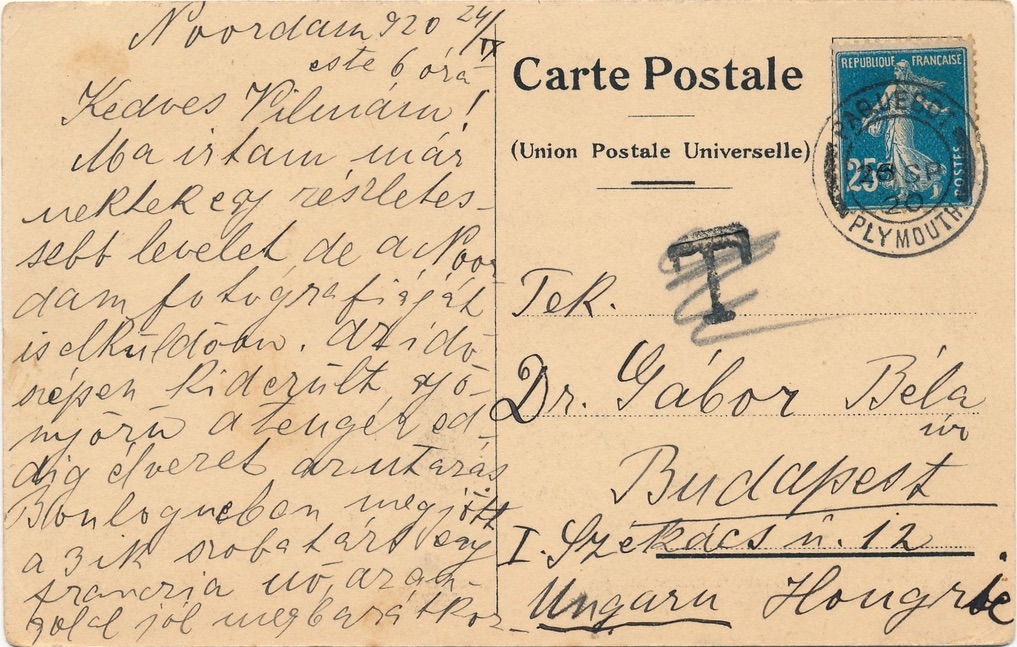 Plymouth : Cachet à date Paquebot Plymouth, 23 septembre 1920, ligne Rotterdam New York (Noordam)