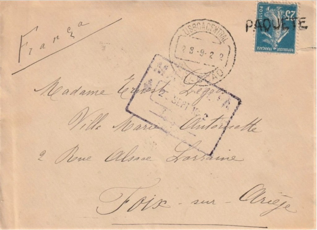 Lisbonne : Cachet à date Lisboa Central et griffe PAQUETE, 23 septembre 1923, posté à bord du Massilia
