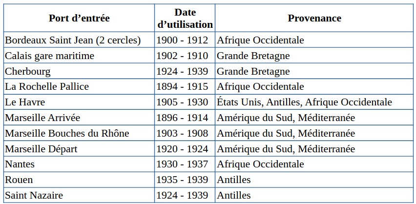 On notera que les griffes de Toulon (utilisée en 1898), Port Vendres (utilisée de 1895 à 1905), Dunkerque (utilisée vers 1904) et Boulogne (utilisée en 1904) ne peuvent se trouver sur un 25c bleu. On notera aussi qu’on traitera à part les marques de Binic, Carteret, Granville et Saint Malo, toutes liées aux iles anglo-normandes.
