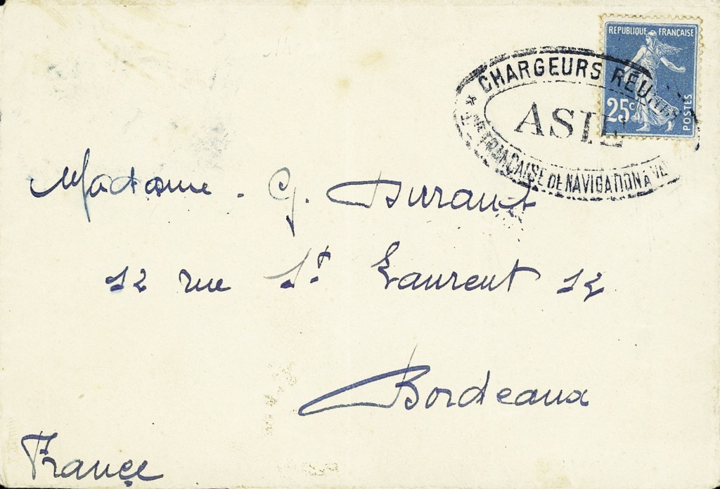 Cachet ovale noir « Chargeurs réunis Asie Cie française de navigation à vapeur » sur lettre (1925)